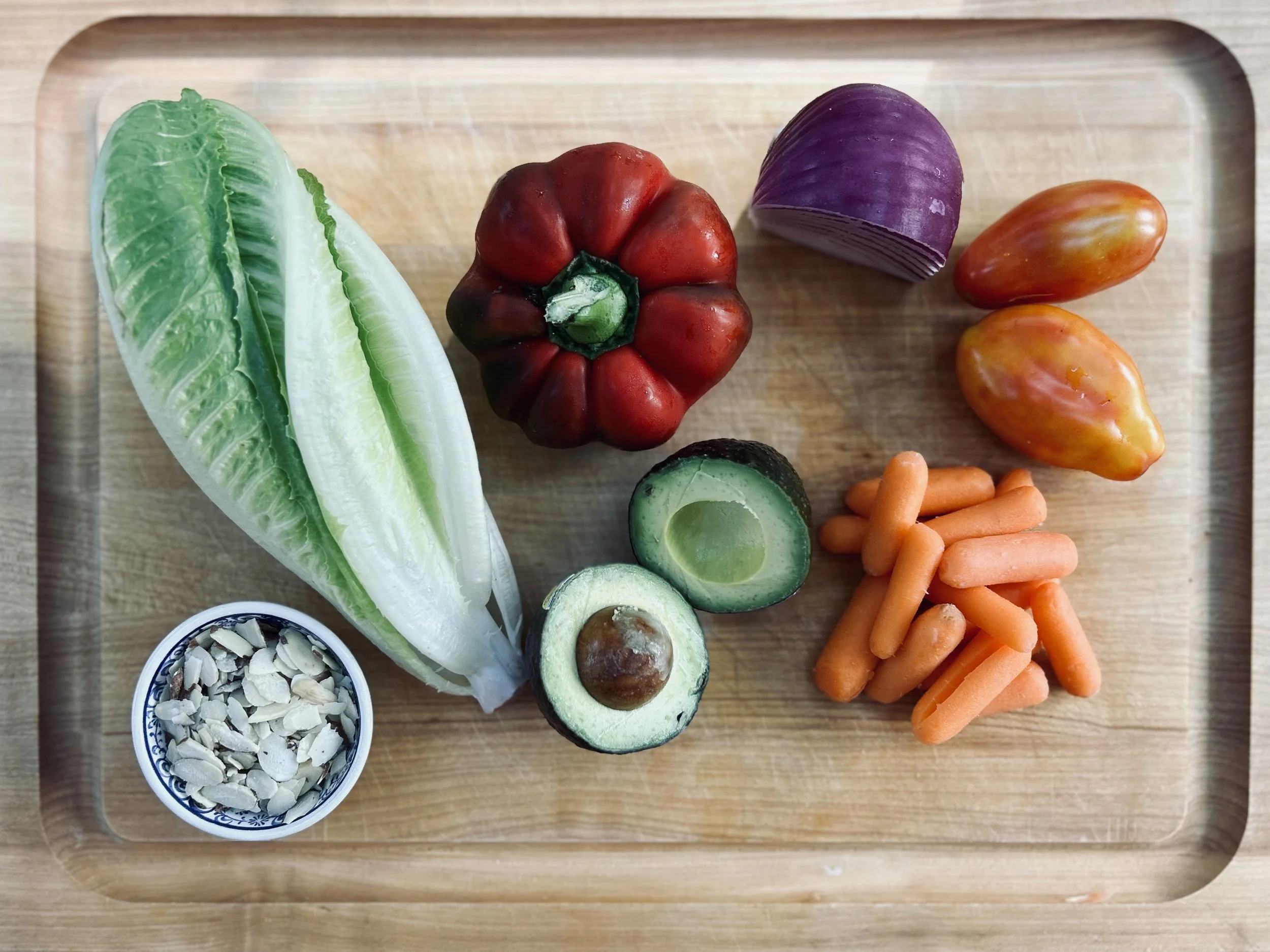 Chop romaine lettuce, carrots, bell pepper, tomatoes, cucumbers, and red onion.