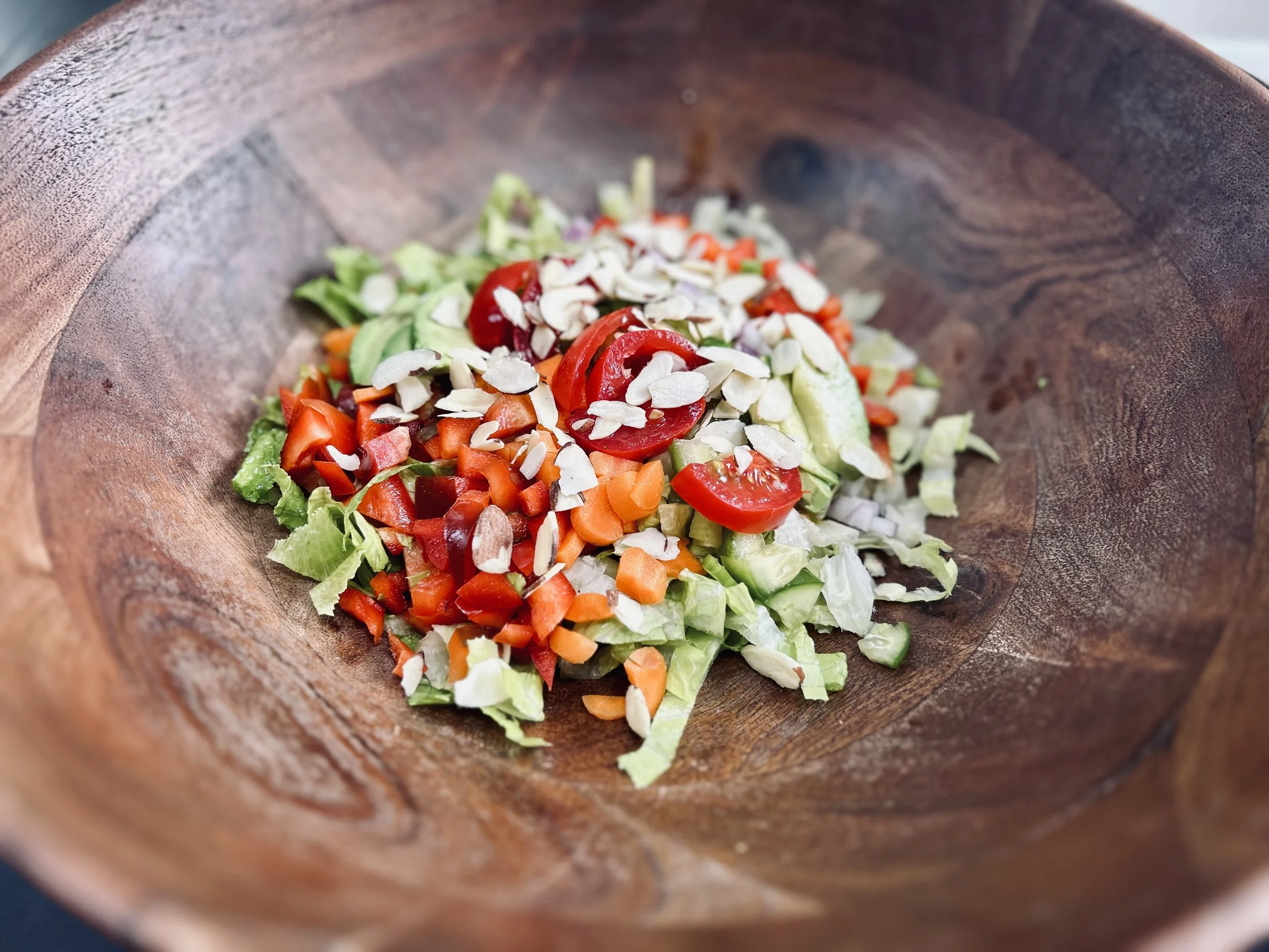 Serve this chopped salad any day of the week! Fresh ingredients, packed with veggies, and topped with a protein of your choice. This is on a regular rotation at our house. Customize for whatever toppings you have on hand. Serve as a side or as a full meal!