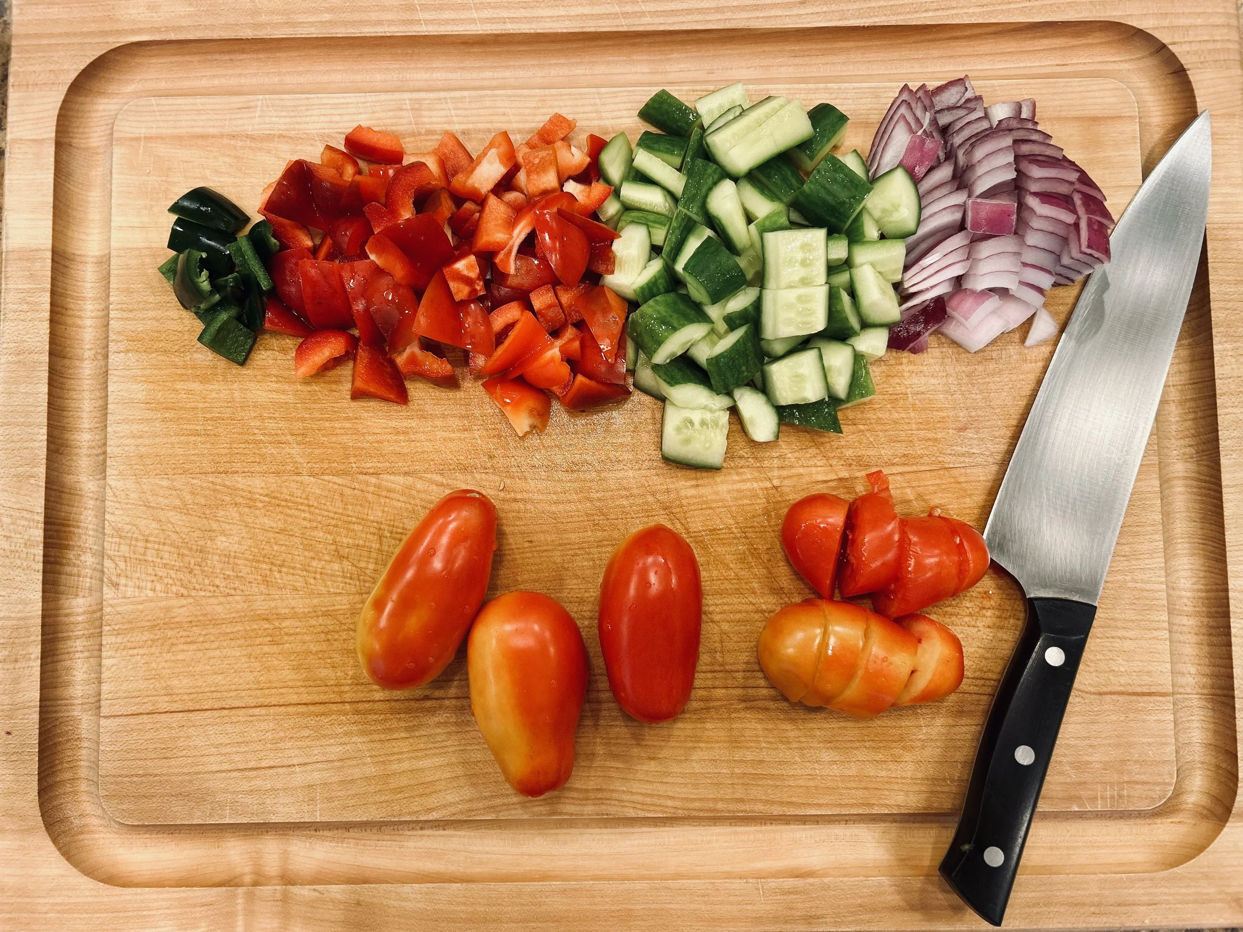Chop veggies (tomato, cucumber, bell pepper, onion, jalepeno) and put in a large bowl. Season with salt, toss, and let sit on the counter for 30 minutes or so. This will release some liquid from the veggies.