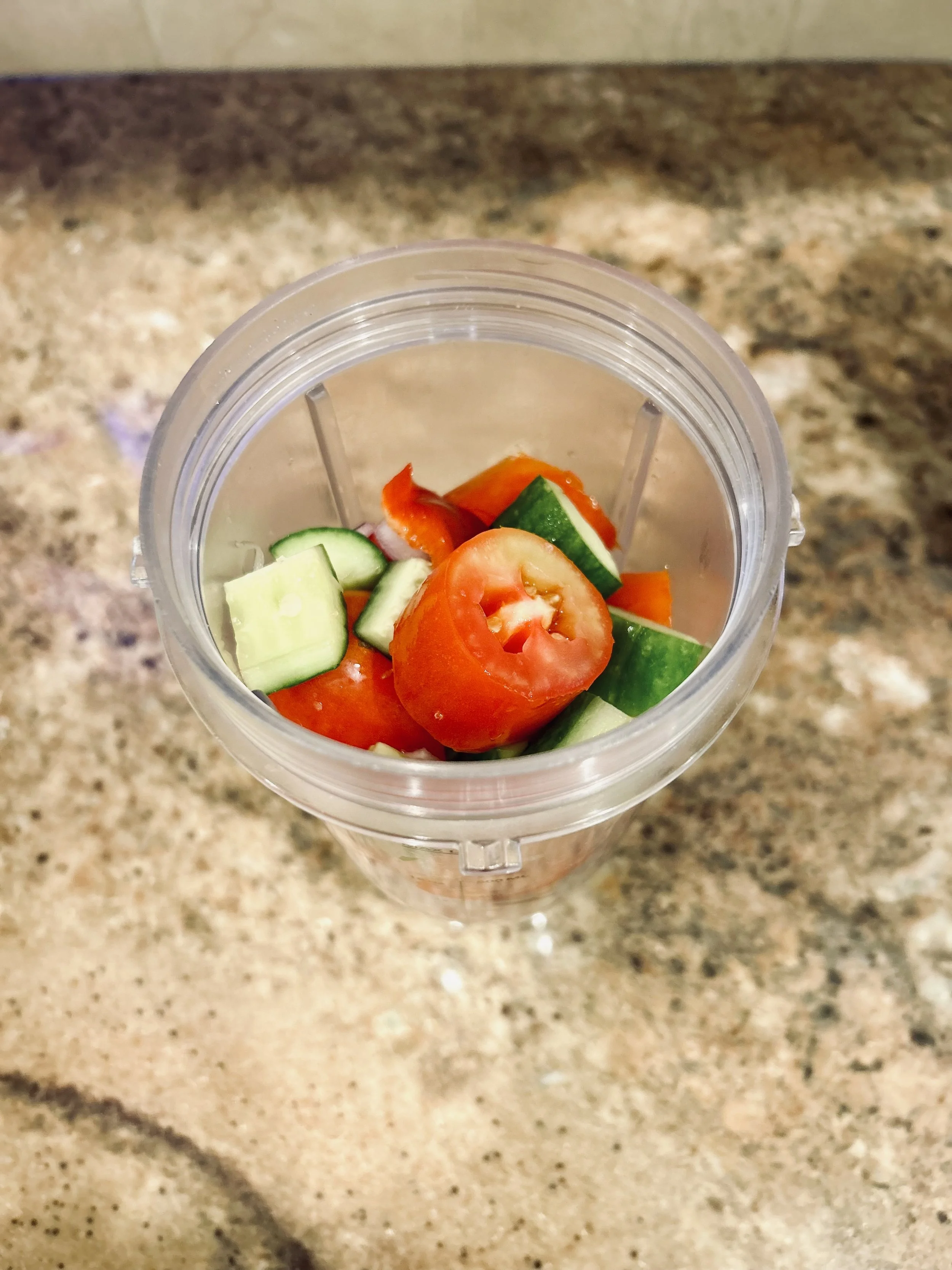 This gazpacho is refreshing for a summer day! This cold soup uses fresh produce and has the perfect amount of spice. Traditional gazpacho uses crusty bread as a base. This version is just as good but without the gluten!