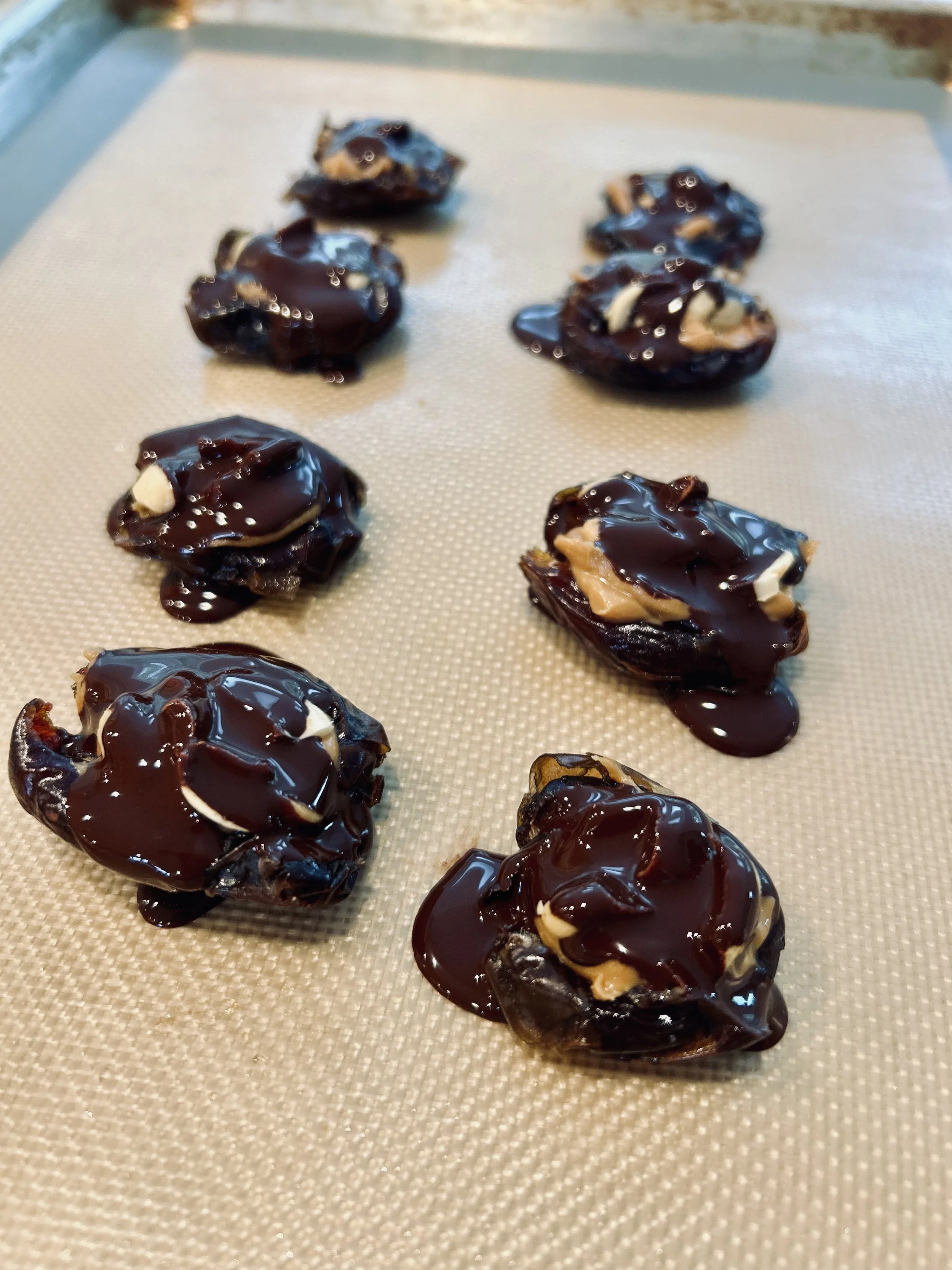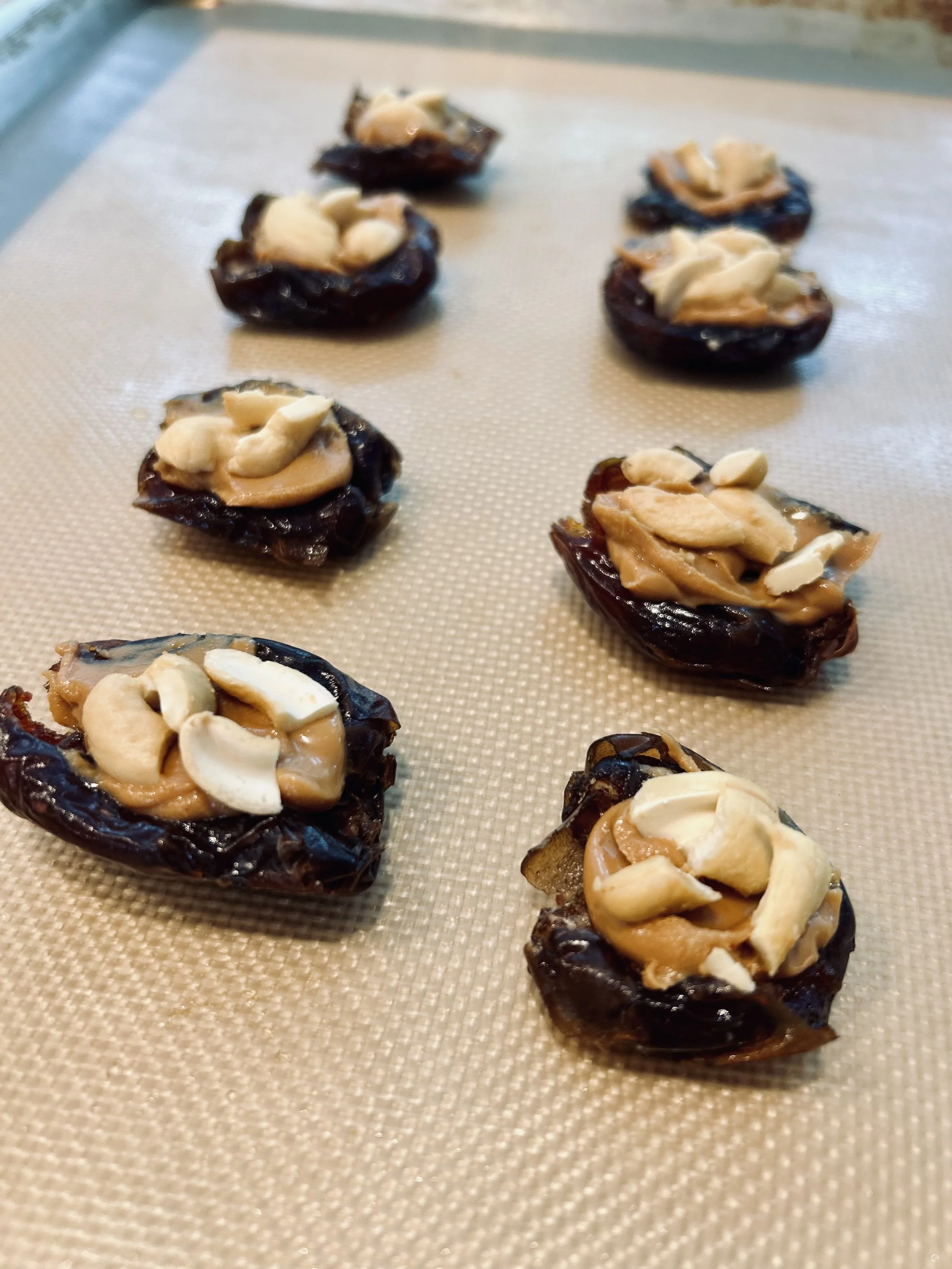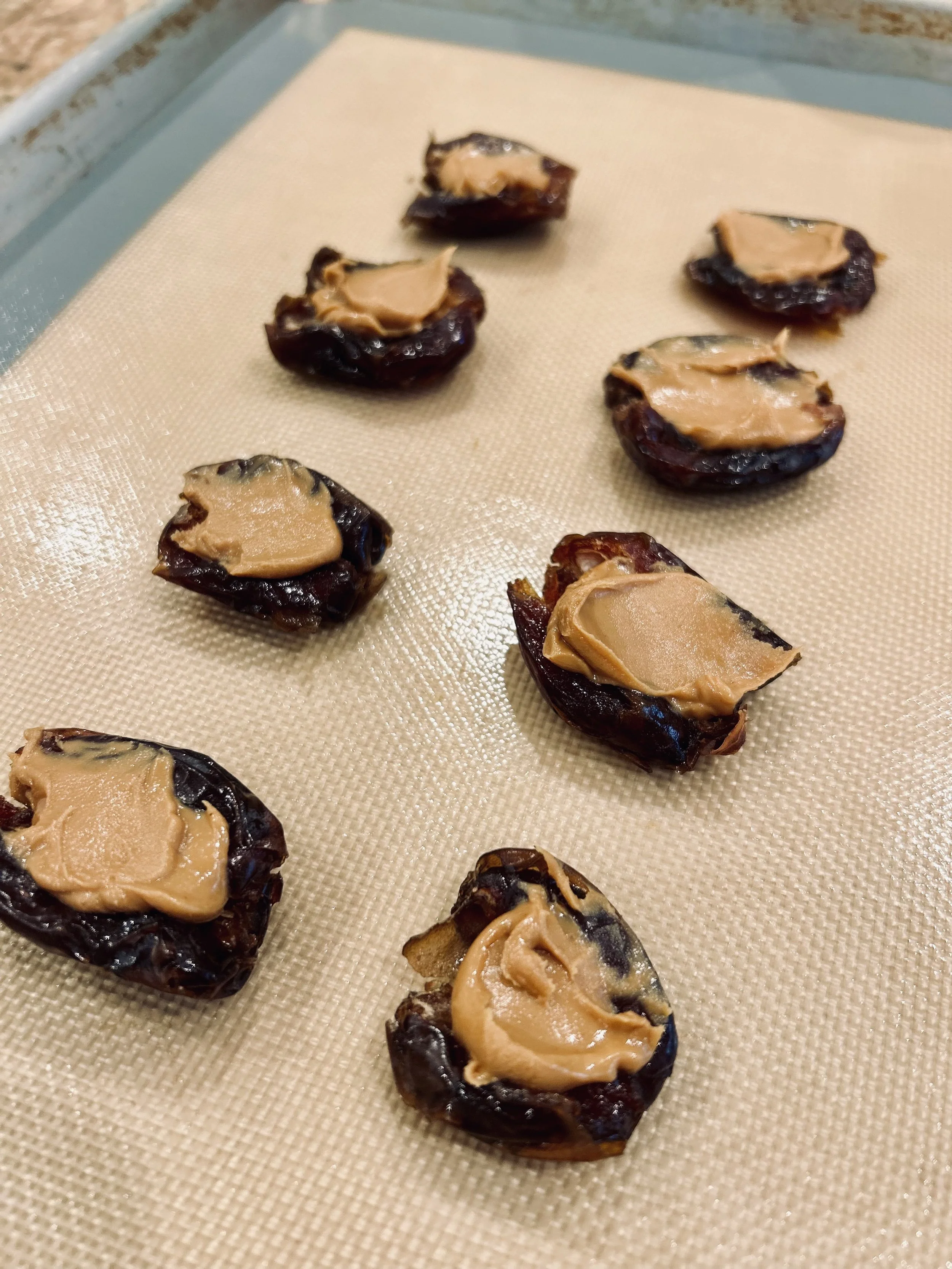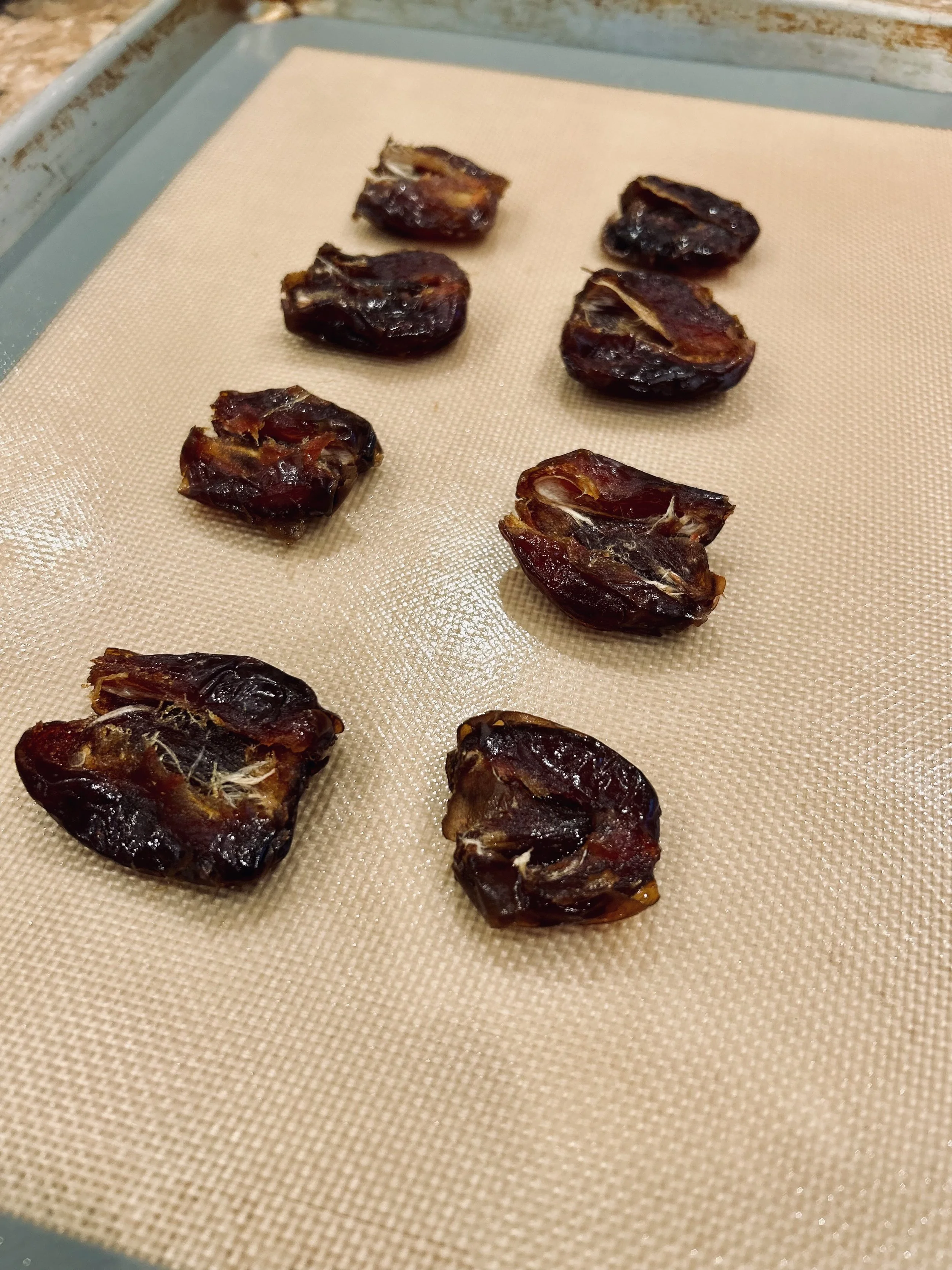 Date layer: Open up each date and smash using the bottom of a heavy cup. Place on lined baking sheet.